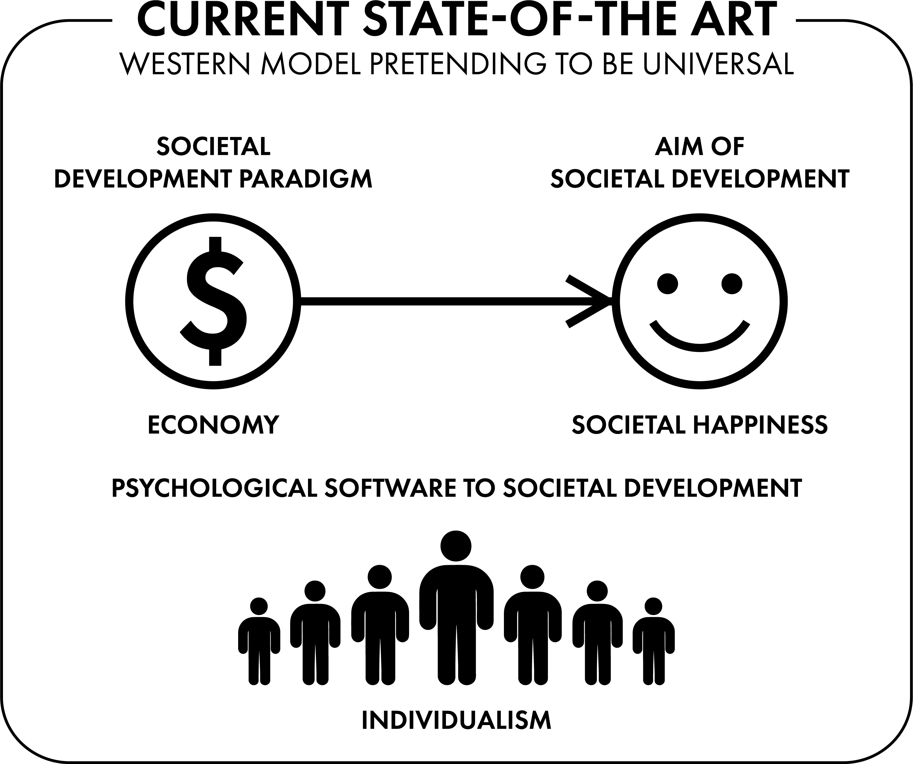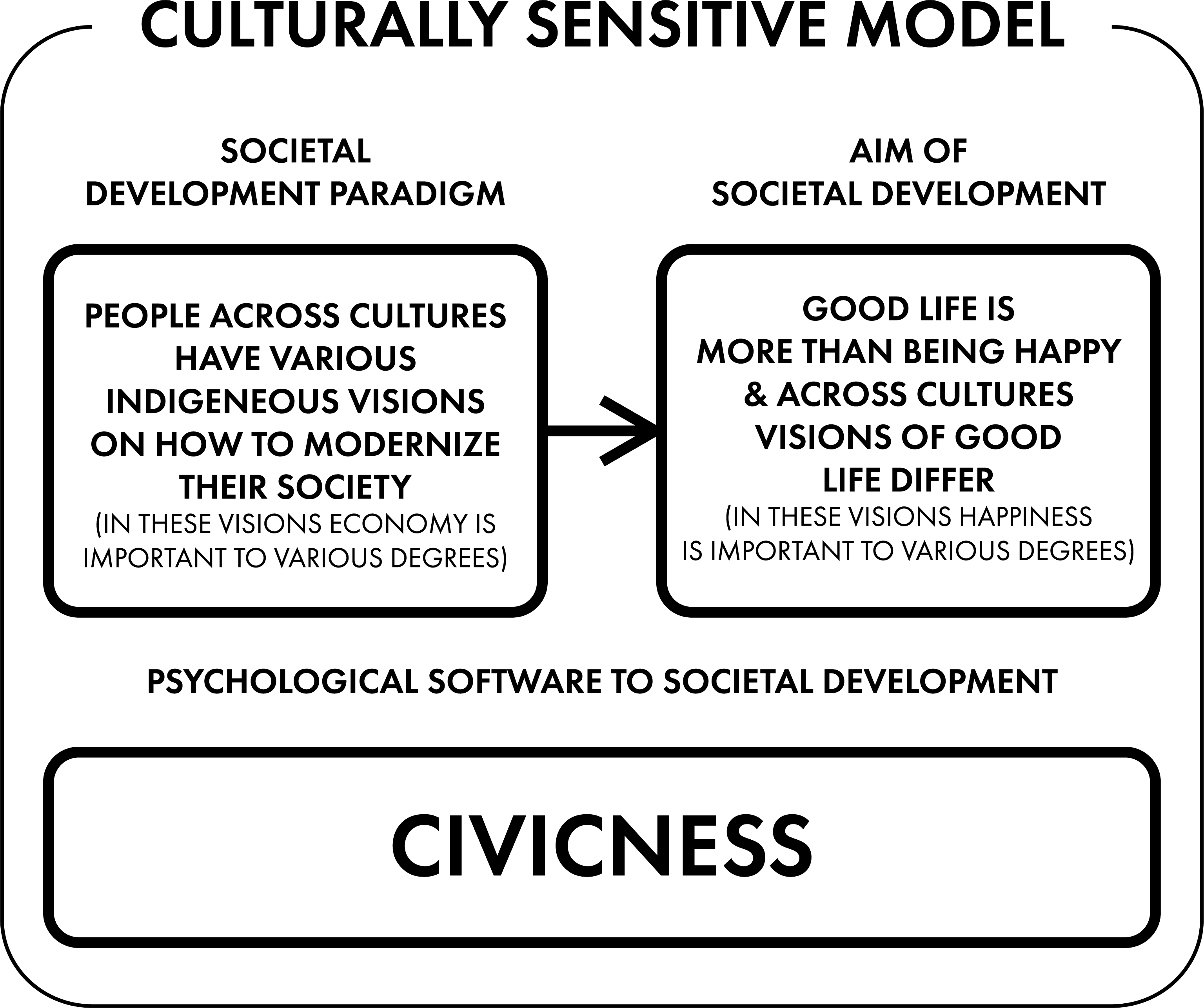 In light of the above, we propose an evolution from the Western-centric model of societal development (which emphasises economic growth, takes societal happiness as the end state, and is driven by psychological individualism) to a culturally sensitive model of societal development. This new model recognises a variety of pathways of societal development, adopts culturally defined concepts of subjective well-being as an end state, and is driven by psychological civicness. In the face of pressing global challenges and the need for collaborative efforts to address them, the study of societal development and well-being in a culturally sensitive and sustainable manner seems not only relevant but imperative.
